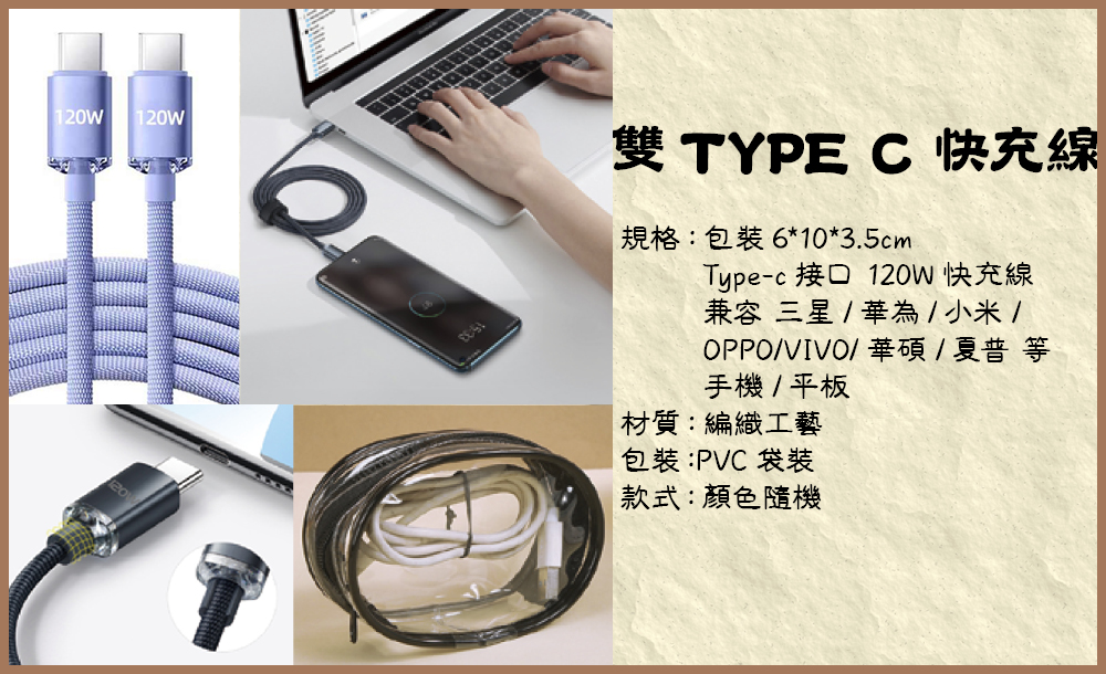 120W快充線 兼容 三星/華為/小米/OPPO/VIVO/華碩/夏普 等 手機/平板材質:編織工藝包裝:PVC袋裝款式:顏色隨機